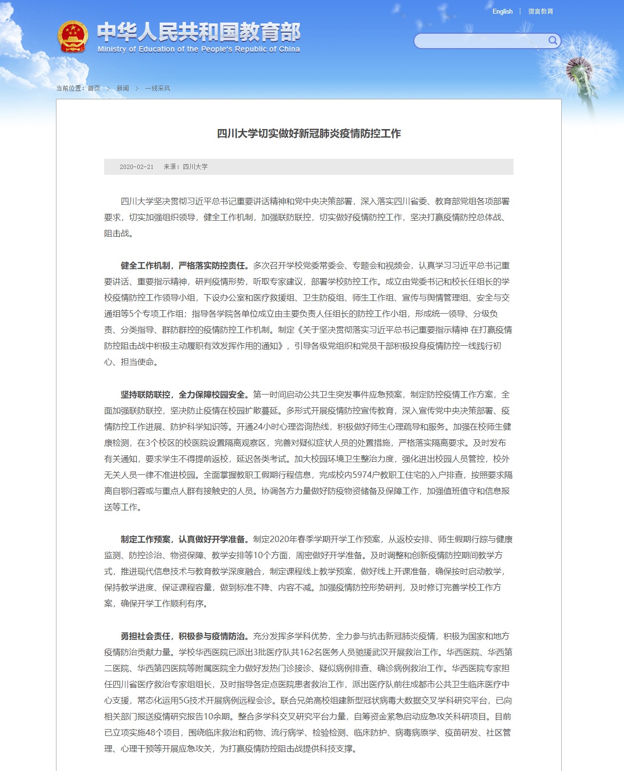 编者按:自新型冠状病毒感染的肺炎疫情发生以来,我校高度重视疫情防控工作,坚持“疫情就是命令,防控就是责任”,认真贯彻落实习近平总书记对疫情防控工作的重要指示精神和教育部、四川省、成都市有关疫情防控工作方面的重大部署,按照坚定信心、同舟共济、科学防治、精准施策要求,全面加强疫情防控工作,坚决打赢疫情防控狙击战。2020年2月21日,教育部网站“一线采风”栏目以《122cc太阳集成游戏切实做好新冠肺炎疫情防控工作》为题,对我校积极做好疫情防控工作进行了报道。以下是报道全文: